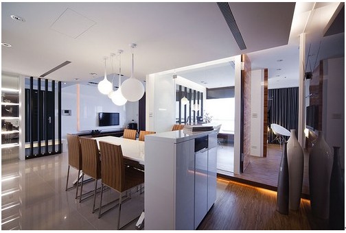 餐廳擁有全方位的透視視野,寬敞的自由場(chǎng)所,將所有空間納入生活領(lǐng)域中。入門(mén)處的格柵加上下方的LED燈具,表現(xiàn)玄關(guān)的意象,一旁鞋柜覆以鋼琴烤漆表現(xiàn)質(zhì)感,巧妙的去化大型柱體,門(mén)片上不規(guī)則圓洞設(shè)計(jì)兼具透氣及夜燈的功能。