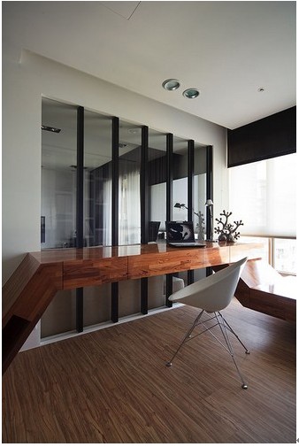 大型書(shū)桌的造型十分時(shí)尚,45度角向上轉(zhuǎn)折成書(shū)桌桌面,一直延伸到大片落地窗前,線條轉(zhuǎn)折可達(dá)90度角,在傾斜45度角向下延伸成為收納柜體的床邊臥榻。室內(nèi)綠意的植物帶來(lái)大自然的氣息,踏著緩慢的步伐,從客廳到臥室再到書(shū)房,每個(gè)房間都與室內(nèi)融合,在利用各形式的玻璃接口,打造出一個(gè)完全開(kāi)放的室內(nèi)空間,自由流動(dòng),透出春季自然的寫(xiě)意畫(huà)面。
