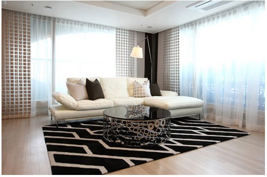 時(shí)尚現(xiàn)代的空間內(nèi)擺放白色沙發(fā)、黑色地毯,白與黑的經(jīng)典搭配,在杏色窗簾的柔和過(guò)度中散發(fā)著家的溫馨。淡黃色的吊頂讓人更容易放松心情,卸去一天的疲憊。深咖啡色的應(yīng)用,讓白、黑、杏色之間有一個(gè)更好的和諧過(guò)度。
