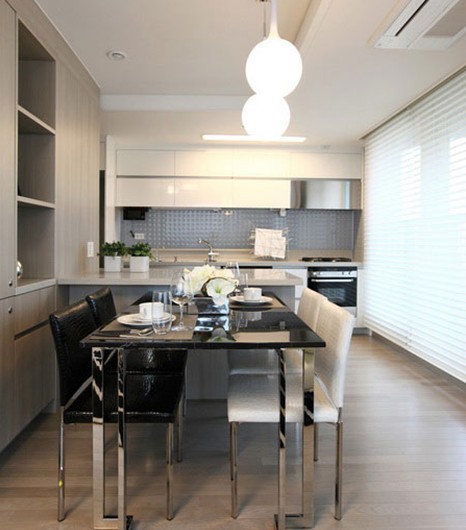 L型的飯桌腳設(shè)計(jì),讓飯桌更加堅(jiān)實(shí)牢固。大面積的落地玻璃窗,讓飯廳的采光更好,讓空間看起來(lái)更加寬敞開(kāi)闊。假如家的坐向不理想,加入白色的百葉窗,阻擋部分陽(yáng)光的同時(shí)部分陽(yáng)光還是能滲透室內(nèi)。圓形的吊頂讓光線的涉及范圍更加大。