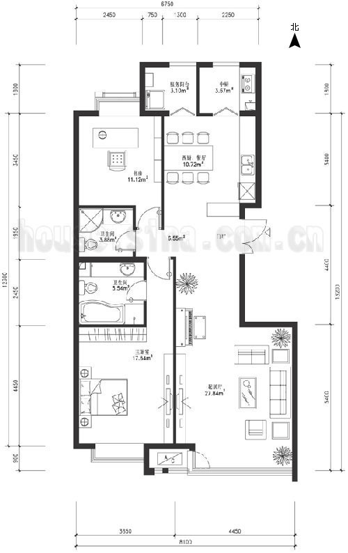 2、臥室區(qū)和書房區(qū),與活動區(qū)動靜分離互不干擾,且保持活動順暢。