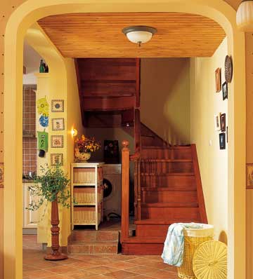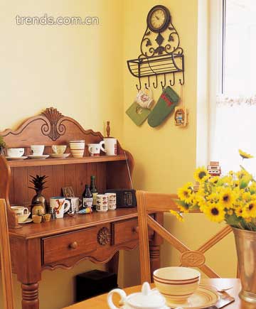 客廳左手邊的樓梯下就是開放式的餐廚空間,這里一如既往地延續(xù)著客廳地面的斑駁,不同的色彩巧妙地區(qū)分了空間。赭石色是懷舊與鄉(xiāng)村永遠(yuǎn)不變的基調(diào)。樓梯下方特別設(shè)計(jì)了壓低吊頂。這樣的設(shè)計(jì)不但不會顯得空間矮小,反而因?qū)哟蔚腻e(cuò)落,使得餐廚間層高得到擴(kuò)展。KEN說當(dāng)初裝修公司是提供設(shè)計(jì)的。但是設(shè)計(jì)師的建議除了色彩其他都是他無法接受的。如果真的按照設(shè)計(jì)師的建議,在這么小的空間按照規(guī)則設(shè)計(jì)廚房操作臺,那么我們今天就無法看到這質(zhì)樸的實(shí)木大餐桌,也無法看到這些擺放可愛物品的餐邊柜了。家具的挑選是隨意的,色彩上也打破陳規(guī),用大膽的白色、黃色與深沉的胡桃木色組合。樓梯拐角的空間被設(shè)計(jì)成簡易的洗衣房,空間得到了合理的利用。草編的洗衣筐還有那樸素的編織陳列柜組合,小空間也有大用途。