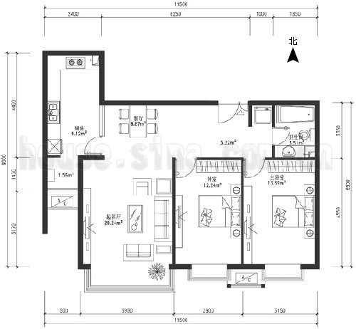 2、兩間臥室面寬較小,放床后實際僅剩通道面積。