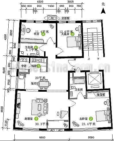 2.起居室面寬6.6米,進(jìn)深4.6米,空間寬敞,與餐廳、門廳功能分區(qū)明顯。