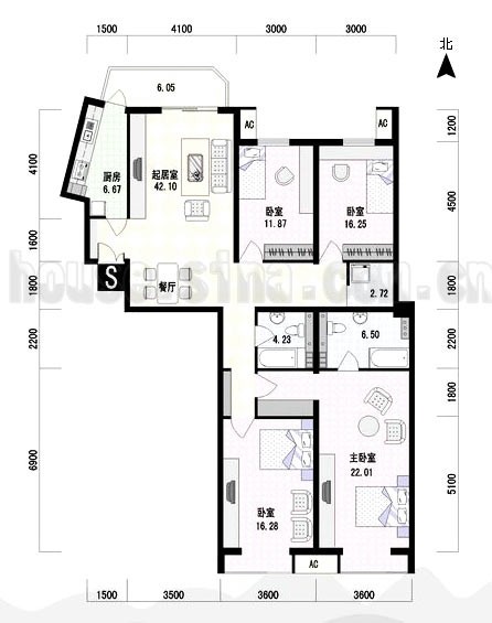 3、起居室的墻面沒有戶內(nèi)門,便于布置家具