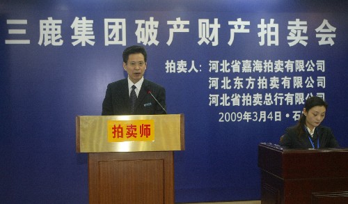 3月4日 “三鹿集團”破產(chǎn)首次拍賣會:三元以總價61650萬元成功競拍 3月4日,拍賣師主持“三鹿集團”破產(chǎn)首次拍賣會。當天上午,石家莊三鹿集團股份有限公司(“三鹿集團”)破產(chǎn)首次拍賣會在河北省石家莊市中級人民法院審判庭舉行。最終,北京三元集團有限責任公司與河北三元食品有限公司組成的聯(lián)合競拍體以61650萬元人民幣的價格競拍成功。 新華社發(fā)(丁立新 攝)