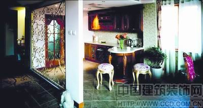由于廚房門前的空間較小,如果使用墻體或其他厚重材質(zhì)將其與門廳分隔,難免會(huì)使此空間顯得太壓抑,因此使用了金色鏤空鐵藝作為隔斷。和屋內(nèi)實(shí)木整體厚重的感覺相比,鐵藝產(chǎn)品借鑒歐洲古羅馬時(shí)期純樸、質(zhì)感的加工工藝,與現(xiàn)代精湛的鍛造手段相結(jié)合,制造出具有歐洲古典風(fēng)格且蘊(yùn)涵現(xiàn)代氣息的隔斷,既有效地區(qū)分了功能區(qū),又充滿輕盈通透的美感,而且鐵藝的質(zhì)感、線條、造型與居室整體的歐式風(fēng)格也非常協(xié)調(diào),并且使廚房門前的狹小空間也得到了充分利用,成為一個(gè)西式餐區(qū)。
