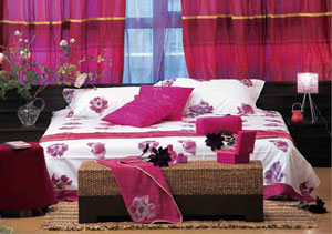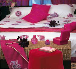 以淺紫紅色的紗簾搭配深紫紅色的條紋布簾,在白地粉花的床品、玫瑰圖案的靠墊、淡粉色的裝飾花、垂珠臺燈、紫紅色墩椅以及小飾品的映襯下,營造出了一個氣氛濃郁氤氳的粉色臥室。