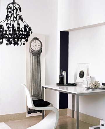 用混搭的風(fēng)格來(lái)更新經(jīng)典的黑白搭配。一條簡(jiǎn)單的黑色長(zhǎng)條色塊增加了角落的深度,本來(lái)容易被忽視的角落反而成為了居室里的亮點(diǎn)。其它配飾的選擇除了顏色非黑即白之外,最好選擇不同的材質(zhì)和質(zhì)地,這樣就會(huì)有既豐富又單純的效果。