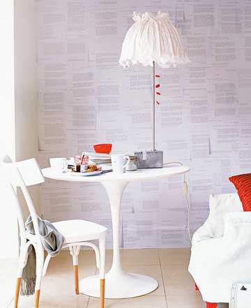 用復(fù)印的文稿裝飾個(gè)性墻面。將墻面涂滿膠水,然后粘上文稿。不要過于擔(dān)心是否整齊,不規(guī)則更增添其吸引力,其他的小工藝還包括用彩紙包裹椅子腿,或者在粉刷家具時(shí),故意留下一部分,以及將臺(tái)燈的拉繩點(diǎn)綴上紐扣,而選擇紅色靠包可能是最簡(jiǎn)單易行的調(diào)色方法了。