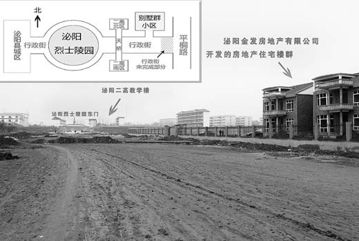 從空間位置上看,由金發(fā)房地產(chǎn)開發(fā)公司所建的住宅樓在烈士陵園東側(cè)約1公里的地方,中間間隔了泌陽縣第二高中校園。住宅樓及別墅區(qū)并沒有侵占烈士陵園土地。