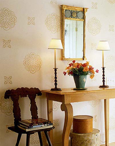 玄關(guān)過道通常較狹窄,大多數(shù)人會(huì)以畫或鏡子增加他的景深與放大空間感。其實(shí),通過色彩鮮艷、形態(tài)美好的花卉組合也能構(gòu)成賞心悅目的景色。比如取大小不一的兩個(gè)陶制花器,分別放入白玫瑰與紫色繡花球,會(huì)立刻讓原本空蕩蕩的玄關(guān)增添了許多生氣。