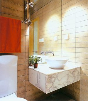 洗面盆可選擇臺式盆或底盆,1.2米X 0.6米的洗手臺對于4平方米的空間來說,就已經(jīng)足夠了。鏡子當然是越大越好,因為它可充分擴大小浴室的視覺效果,但從其容易清潔及美觀的角度來看,一般設計成與洗手臺同寬即可。另外,也可直接在衛(wèi)浴的一角安裝角形洗面盆或柱式洗面盆,這樣能使衛(wèi)浴間有更多的回旋余地。