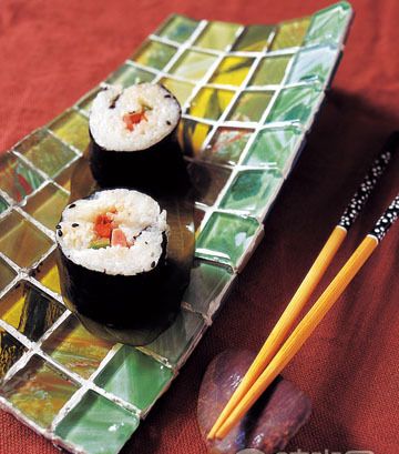看慣了家里的平盤(pán),這款自由扭轉(zhuǎn)的壽司盤(pán)是否給了你一點(diǎn)點(diǎn)驚喜?新型的玻璃馬賽克本身就有裝飾的花紋圖案,有點(diǎn)寫(xiě)意,很適合做壽司盤(pán),強(qiáng)化了它濃濃的東方味道。不過(guò),由于它不是平的,制做起來(lái)就多了道工序,兩層馬賽克之間就需要夾進(jìn)一層薄的鐵板或者鐵網(wǎng),以固定它的造型。