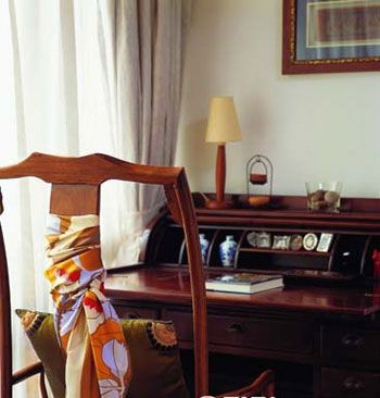 角落的書桌安靜私密,古典書桌與座椅,搭配真絲絲巾與錦緞靠墊,顯示出女主人在細(xì)微之處的自我關(guān)懷。