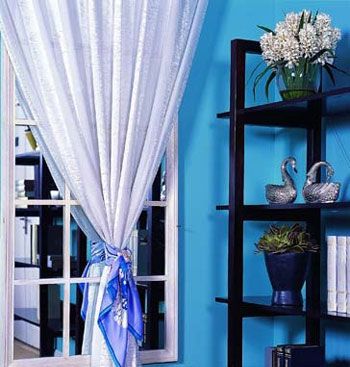 天鵝與湖藍(lán)色的墻面,制造了具有童話意味的夢幻角落。藍(lán)色絲巾挽住潔白的窗簾,搭配出女性的精神力量。