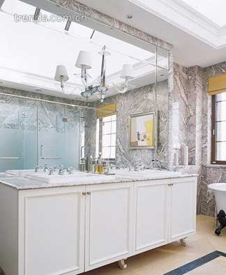 想讓衛(wèi)浴空間裝飾得另類、出彩,還可以考慮使用以下材料來制作浴室柜、洗面盆臺面等。用天然大理石作為浴室柜的臺面,要盡量避免唇膏等有顏色的化妝品涂到臺面上,這種有油性的顏色會滲透到石材里。