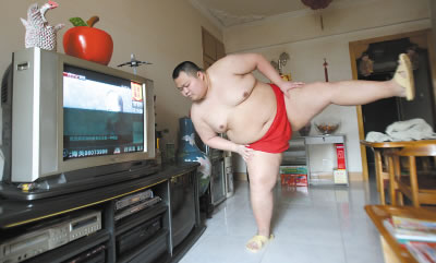 短短4年時(shí)間,體重從70公斤增加到了至少150公斤,沙坪壩區(qū)陳家灣一胖哥喜歡上了冷門的相撲運(yùn)動(dòng),并打算3年后自費(fèi)前往日本學(xué)習(xí)相撲術(shù),成為一名職業(yè)相撲手。這名“重慶相撲男”的照片一貼上網(wǎng)就成了網(wǎng)絡(luò)紅人。由于重慶的相撲選手只有他一個(gè),一直找不到合適的對(duì)手過(guò)招,無(wú)奈之下,前日晚上,這位紅人在天涯上發(fā)帖,正式邀請(qǐng)一位泰拳選手進(jìn)行一場(chǎng)另類的比賽。