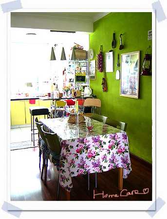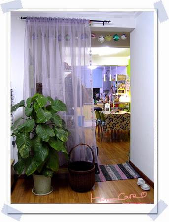 從這里看餐桌,一個綠植,一個紫色的紗簾,生機和浪漫盡在眼底