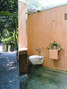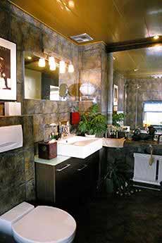 這個(gè)衛(wèi)生間的妙處當(dāng)然就是要你多一點(diǎn)頑皮之心了。不要拘泥什么定式,其實(shí)任何一種材料、任何一種裝飾品在設(shè)計(jì)伊始并沒有被規(guī)定必須做什么,只要展開想象,當(dāng)然就可以獨(dú)一無二、與眾不同。