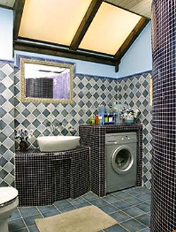 基調(diào)是一片蔚藍(lán),藍(lán)色的馬賽克、灰藍(lán)色的地磚。因?yàn)榭臻g相對(duì)較大,所以主人就有了很大的發(fā)揮余地,為洗衣機(jī)量身定做的小臺(tái),上面還可以放一些雜物,弧形的洗手池、手盆與同樣造型的整體浴房呼應(yīng)著,“整體浴房”其實(shí)是主人自己用磚砌出來然后貼上藍(lán)色馬賽克做成的。大面積使用馬賽克,并在頂部鋪上了溫暖的桑拿板,刻意做成的斜屋頂式燈箱是主要光源,設(shè)計(jì)的本意是希望給這個(gè)沒有一扇窗子的衛(wèi)生間,帶來一種有天窗的錯(cuò)覺。