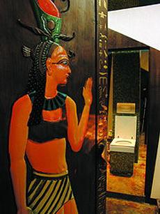 這個(gè)衛(wèi)生間點(diǎn)睛之處在于門,手繪的埃及傳統(tǒng)人像,做出了浮雕的效果,花邊是埃及的壁畫上的象形文字,厚重的大門配以手感很好的金色把手,讓人在推開之前對(duì)里面的情形充滿了想像。