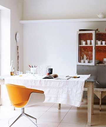 一把極具風(fēng)格的橙色椅子和橙色材質(zhì)的櫥柜使實(shí)用的廚房凸顯性格。精致的亞麻提花的舊桌布既遮蓋了有些磨損的桌面又給廚房帶來(lái)些許溫和雅致的氣質(zhì)?,F(xiàn)在廚房在不做飯時(shí),也可以被用來(lái)看書或者思考了。