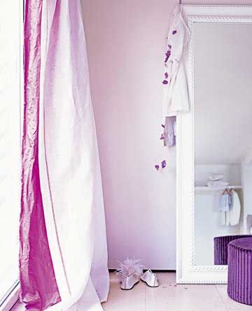 全白的亞麻窗簾襯上一層奢華的紫羅蘭絲綢,魅力即現(xiàn),為配合浪漫的紫色調(diào),絲絨座墩、 衣服上的配飾,都選用了不同深淺的紫色系。