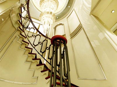 優(yōu)點:具有強烈的動態(tài)美,多在廳堂偏中部位旱地拔蔥。由于不靠墻,圍欄不能借助墻體,需加上透空欄桿,這就更好地表現(xiàn)了樓梯的藝術(shù)之魅。但這種樓梯由于每一段跨度較多,因此安全性較差。有老人和學齡前兒童的家庭,建議慎重使用。