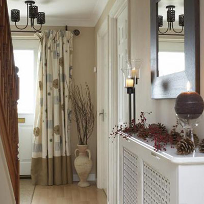 這個(gè)走廊也許沒(méi)有太多的個(gè)性,有點(diǎn)中性化,但是細(xì)節(jié)的設(shè)計(jì)卻是獨(dú)具匠心的。門廳的盡頭掛一款舊織物窗簾,和褐色的墻壁和白色的柜子完美搭配。