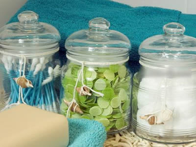 瞧這些清爽的玻璃瓶,靜靜的收藏好小棉簽等物品。而且提高的房間的亮度,也好像在告訴你,這是您在海邊漫步時,看的一場珠寶展覽。每一個小瓶子都吊著貝殼掛墜,似乎都讓您的聽到大海的聲音。