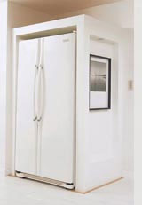 小面積公寓廚房一般都是按小尺寸的冰箱制定出空間。不妨給大冰箱制作一個(gè)外衣箱,側(cè)面可以適當(dāng)點(diǎn)綴一下,看起來(lái)整潔美觀。