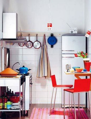 如果你平時很少下廚,不如把采光良好的明廚劃入起居空間,而把廚房隔壁的狹小空間布置成廚房。根據(jù)房間大小,選擇尺寸適合的冰箱、灶具、餐臺,建議選擇白色和不銹鋼顏色的廚房產(chǎn)品,用鮮亮色彩的餐廚用具做適當點綴,獲得玲瓏精致的效果。