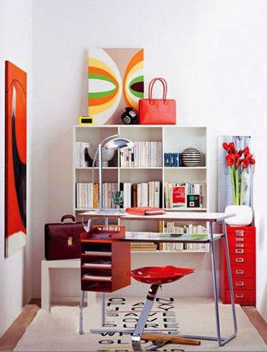 盡管多次告誡自己,不要把工作帶回家,可是,如果在家中突然獲得工作方面的好點子,最好還是馬上記錄下來。為了不影響家居的整體感,把角落布置成簡潔實用的工作間是最好的方法。鮮艷的色彩能令空間顯得更加開闊,同色系運用效果整齊。結構輕盈的書桌和書架,既保證功能,還能釋放更多空間。