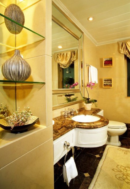 豪華衛(wèi)生間裝修:用金屬色點(diǎn)綴衛(wèi)生間,大理石臺面,玻璃裝飾架,處處顯示主人高品質(zhì)的生活最求。