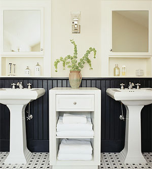 水盆上方的一對墻面柜可以用來存放牙膏、漱口水、阿司匹林等用品。經(jīng)常會使用的用品,如 肥皂、洗發(fā)沐浴用品、香水、化妝品等就存放在墻柜下方的置物格里。兩個水盆之間的櫥柜就用來存放毛巾和浴衣等。
