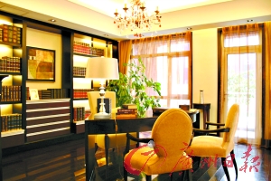 書房考究起來比較有學(xué)問。一般人書房內(nèi)有臺燈就夠了,因?yàn)榭磿恍枰酂簦侨绻挥信_燈的話,當(dāng)主人視力疲勞想轉(zhuǎn)移視線時就會出現(xiàn)問題,周圍沒有光線供眼睛休息,就容易出現(xiàn)眼花、頭暈的感覺,而這間書房燈飾的設(shè)計(jì)正好考慮到了這一點(diǎn),而且還可以將屋內(nèi)的照片和畫卷照明,讓人倍感溫馨。