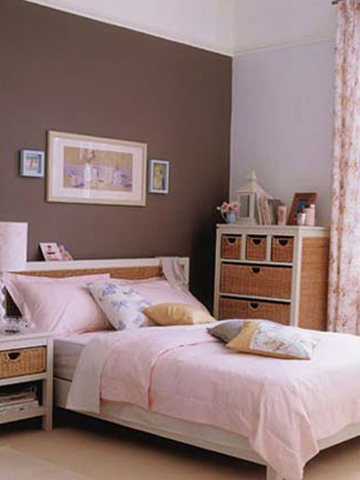 粉紅色的墻面定下整體基調(diào),給人以朦朧的浪漫感覺(jué)?;野咨蛎靥?,以及白色窗簾與粉紅色過(guò)度十分自然。白色的床邊小桌和柜子仍然帶藤制抽屜,桌上放有藍(lán)色托盤(pán)和藍(lán)色臺(tái)燈,是整體色調(diào)中活潑的一筆,柜子上飾以小圓鏡、藍(lán)色花瓶和小花枝。灰白色的床上覆以粉紅色的床罩,白色床單、白色枕頭、藍(lán)、粉色小靠墊,溫暖而舒適。