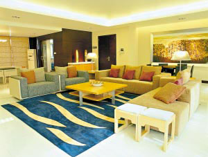 “光影,搭配著柔和布藝沙發(fā),空間在一張一弛,一明一暗,視覺(jué)在靜靜的延伸,偶有光點(diǎn)在空間里慢慢地流淌……”在葉武建所推崇的“軟造型”中,燈光扮演著極其重要的角色。木制的夾板裝飾墻的背景燈可開(kāi)可滅,透過(guò)矩形光帶形成潛移默化的軟造型。在天花板上,巧妙嵌綴的鹵素?zé)敉断碌呐狞S色光斑,不經(jīng)意地散落在客廳光潔的地面上,雕琢出夜晚迷人的情調(diào)。