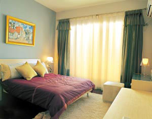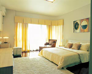 白色系墻面,淡橘色的窗簾,米色的床被、地毯,整個(gè)主臥形成一種明快的色彩,顯得和諧、淡雅。整體對(duì)比柔和,避免給人太強(qiáng)烈鮮明的感覺(jué)而不易入眠。床背景墻上的掛畫(huà),不僅是主臥里視覺(jué)聚焦的中心,同時(shí)也富有現(xiàn)代氣息??Х壬膯稳松嘲l(fā),作為窗口的一個(gè)小小休閑區(qū)域,方便主人臨睡前和起床后偶爾小坐。