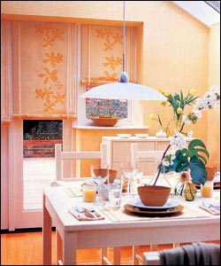 墻面粘貼了大面積的淡黃色壁紙,房間有了色彩。但僅僅如此是不夠的,如果在門窗上加上十分搭配的布簾,效果會(huì)更好。這里用印有簡單花朵的淡黃色壁布做成簡練的幾道卷簾。雖然餐廳里的家具都很簡單,但挑選風(fēng)格諧調(diào)的壁紙、壁布相互搭配,餐廳開始變得有情致。