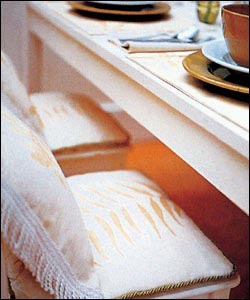 尋常普通的餐椅需要轉(zhuǎn)換感覺,可以用剩余的布料,也可以選擇風(fēng)格相似的壁布來幫忙。這里風(fēng)格比較簡約,不適合做椅套。只是給椅子加上一張坐墊,再縫制一張舒服的靠墊,簡陋的椅子從容變身,富有情趣的用餐場(chǎng)景出現(xiàn)了。