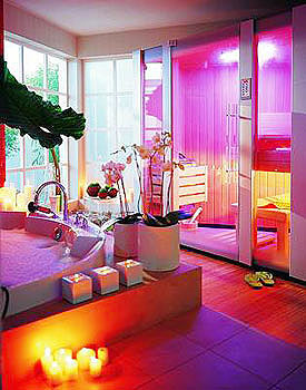 純凈的紅黃藍綠任意穿梭翻滾,可以有點卡通,可以有點童趣,可以丁丁當當如童聲笑語般張揚燦爛。白色是最好的底色,只需要留住足夠的底色,其他顏色便可以百無禁忌。同理,在選擇浴室用具上,新穎、別致、夸張的造型是上選。