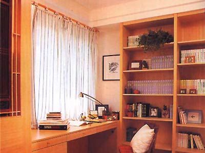 書房的家具除了要有書櫥、書桌、椅子外,兼會客用的書房還可配備沙發(fā)茶幾等。書櫥應靠近書桌以存取方便,書櫥中可留出一些空格來放置一些工藝品以活躍書房的氣氛,書桌應置于窗前或窗戶右側,以保證看書、工作時有足夠的光線,并可避免在桌面上留下陰影。書桌上的臺燈應靈活、可調,以確保光線的角度、亮度,還可適當布置一些盆景、字畫以體現書房的文化氛圍。