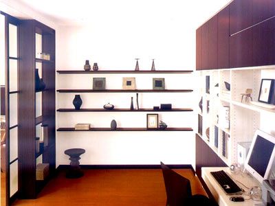 面積充裕的居室中,可以獨立布置一間書房,面積較小的居室可以辟出一個區(qū)域作為學習和工作的地方,可用書櫥隔斷,也可用柜子、布幔等隔開。
