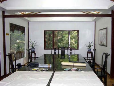 靠窗的書桌,要注意窗外十公尺以內其它房屋射入的尖角,尖角距離越遠影響越小,越近影響越大。寫字臺上的工作必需用品,也是書房的裝飾陳列品。如文房四寶的安置,筆筒、筆架的擺放,無不具有很強的觀賞價值且具有裝飾性。