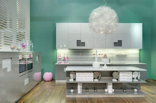 如果房屋比較高,也可以在開放式廚房的正中使用吊燈,四周環(huán)繞射燈,但是燈的造型不能太復(fù)雜,以免日后的清潔工作帶來麻煩。當(dāng)然,從節(jié)能上考慮,還是不要安置太多的燈,最好選擇本身自帶燈的櫥柜。