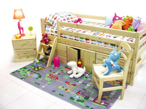 由于兒童好動的天性,在選擇家具時應(yīng)棱角圓滑,杜絕銳角,固定家具用的鉚釘?shù)炔煌饴?,或鑲以橡膠條等柔軟之物,以防孩子在奔跑中碰傷。床邊應(yīng)設(shè)有護欄,結(jié)實而且還有一定的高度,以防在睡眠中從床上墜下來跌傷,柜櫥門的把手也應(yīng)方便兒童的握取。