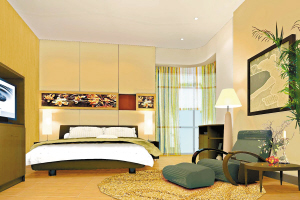 臥室更多從實用方面考慮,風格上更偏向現(xiàn)代感,但也有中式元素的運用,比如墻上用中式木通雕,底面裝上鏡子。其余的都是現(xiàn)代元素。