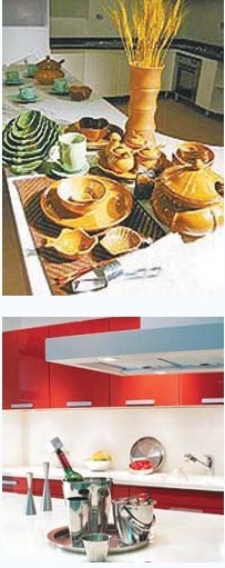 盡管廚房的功能性永遠(yuǎn)大于裝飾性,但是,美觀似的餐具又具備了特有的裝飾效果。比如各種線條構(gòu)成的不銹鋼網(wǎng)盤、玻璃架上的餐具或茶具、陳列開來的瓷器或玻璃器皿等,林林總總,都有極強(qiáng)的藝術(shù)性和觀賞性。